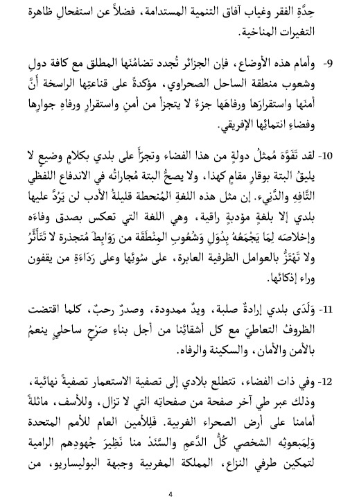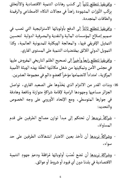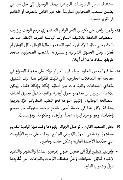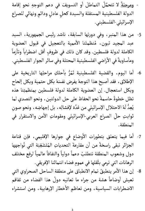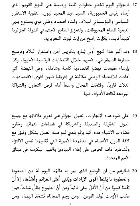 - وقد أكد رئيس الجمهورية السيد عبد المجيد تبون في رسالته بهده المناسبة الغالية، وأقتبس" حِرْصَ الدَّوْلَةِ الـمُسْتَمِر على الدِّفَاعِ عَنْهُمْ، وَرِعَايَةِ مَصَالِحِهِم .. وَتَوْفِيرِ الشُّرُوطِ الـمُثْلَى لإنْدِمَاجِهِم في مَسَارِ التَّقْوِيمِ وَالتَّجْدِيدِ الوَطَنِيّ، وَفي دِينامِيكِيَّةِ التَحَوُّلِ بالجزائر نَحْوَ الـمُسْتَقْبَل بِرُؤْيَةٍ جَدِيدَةٍ وَاثِقَةٍ في مُقَدَّرَاتِ البِلاد، وَفي كَفَاءَاتِها، وَوَعْيِّ شَبَابِهَا وَشَعْبِهَا بِالتَّحَدِّيَاتِ، وَمُؤْمِنَةٍ بِكَسْبِ الرِّهَانَاتِ، وَتَحْقِيقِ أحْلامِ شُهَدَائِنَا الأبْرَار بجزائرَ مَرْفُوعَةِ الرَّأْسِ، جزائرُ الوَطنِيَةِ وَالكرَامَةِ، الـمُتَمَسِّكَةِ بِـمَبْدَأ الحَقِّ وَالإنْصَافِ فِيمَا يَتَعَلَّقُ بِـمِلَفِّ الذَّاكِرَة، الّذي تُحَاوِلُ أوْسَاطٌ مُتَطَرِفَةٌ تَزْيِيفَهُ، أو إحَالَتَهُ إلى رُفُوفِ النِّسْيَانِ، في وَقْتٍ تَحْتَاجُ فِيهِ مَسْأَلَةُ الذَّاكِرَة إلى نَفَسٍ جَدِيدٍ مِنْ الجُرْأَةِ وَالنَّزَاهَةِ للتَّخَلُّصِ مِنْ عُقْدَةِ الـمَاضي الاستعماري، وَالتَوَجُّهِ إلى مُسْتَقْبَلٍ، لا إصْغَاءَ فِيهِ لِزُرَّاعِ الحِقْدِ وَالكَرَاهِيَةِ، مِمَّنْ مَازَالوا أَسِيرِي الفِكْرِ الاسْتِعْمَارِيِّ البَائِــــدِ.." نهاية الاقتباس