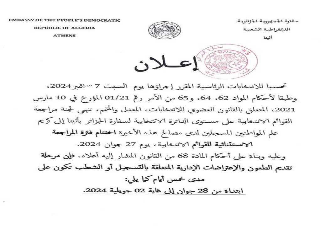 In accordance with the instructions of the President of the Republic and the directives of the Ministry of Foreign Affairs and the National Community Abroad, the Embassy of Algeria in Athens informs all members of our community residing in Greece and Albania, holders of valid foreign passports, that they can, exceptionally, starting from May 1st until October 31st, 2024, enter and exit the national territory without a visa, as long as they fulfill the following conditions: